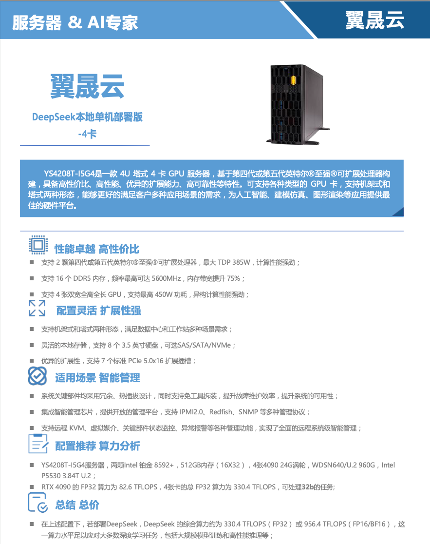 翼晟云DeepSeek本地單機部署版-4卡方案